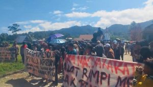 Salah satu spanduk yang terbentang berbunyi: “Stop perusahaan! Tanah Rampi adalah warisan adat. PT KA segera angkat kaki dari Rampi.”