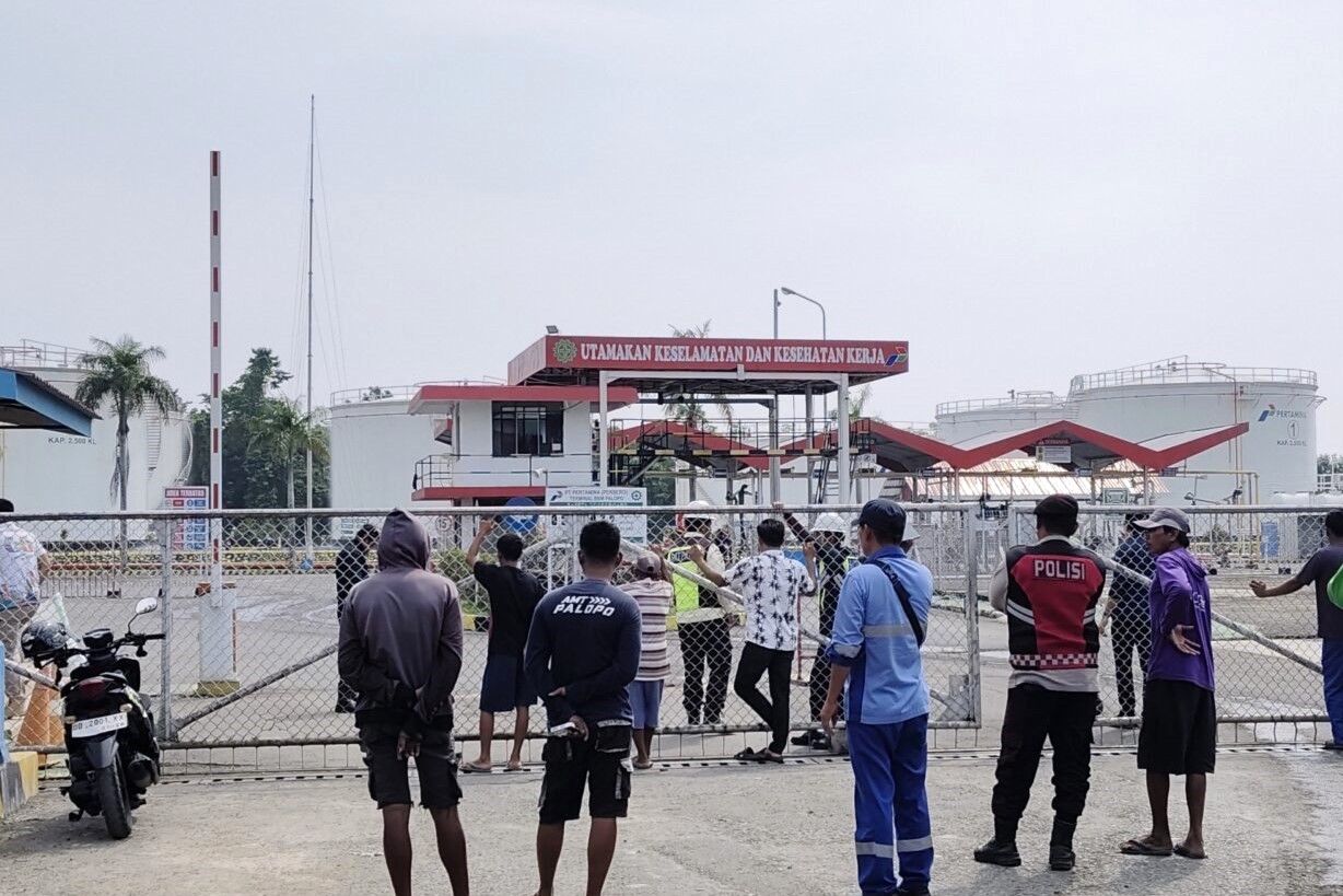 Sejumlah warga tampak berdiri di balik pagar Terminal BBM Pertamina Karang-Karangan, Luwu — pusat distribusi solar subsidi ke seluruh SPBU di wilayah Luwu Raya. (FT: Ist)