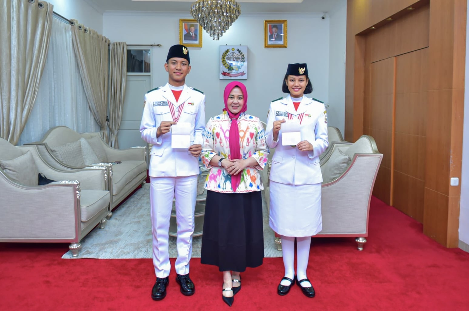 Fatmawati Rusdi menyambut Aliah Sakira dan Nadhif Infanteri Ibha, Paskibraka Nasional asal Sulsel, sambil menyerahkan tabungan pendidikan sebagai bentuk apresiasi. (FT: Hms Pemprov)