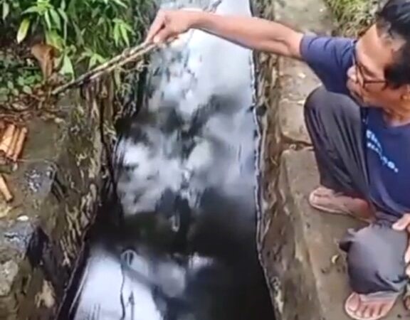 Insiden yang terjadi pada Sabtu (23/8/2025) itu membuat aliran irigasi warga berubah warna menjadi hitam pekat dan merembes hingga ke persawahan.