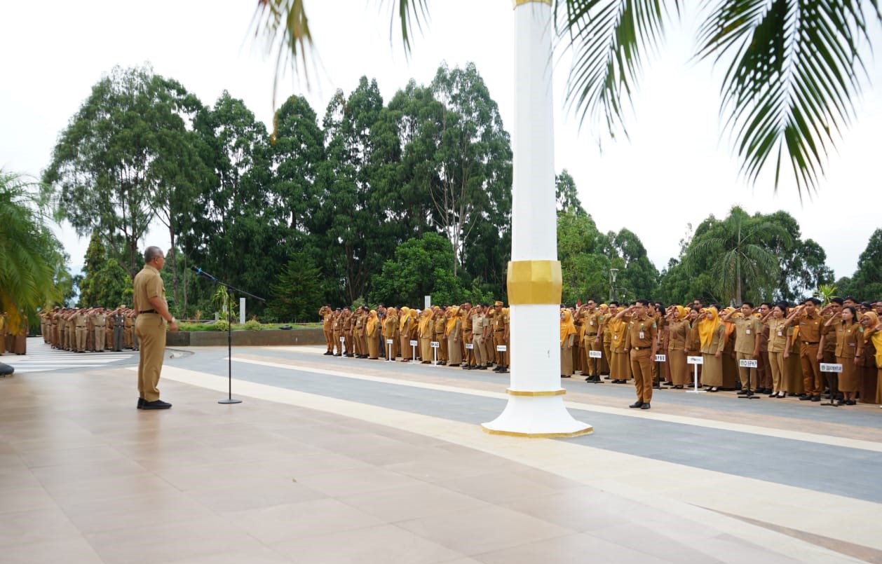 Sekda Lutim H. Bahri Suli memimpin apel pagi di halaman Kantor Bupati Luwu Timur, Senin, 25 Agustus 2025. (FT: Hms)