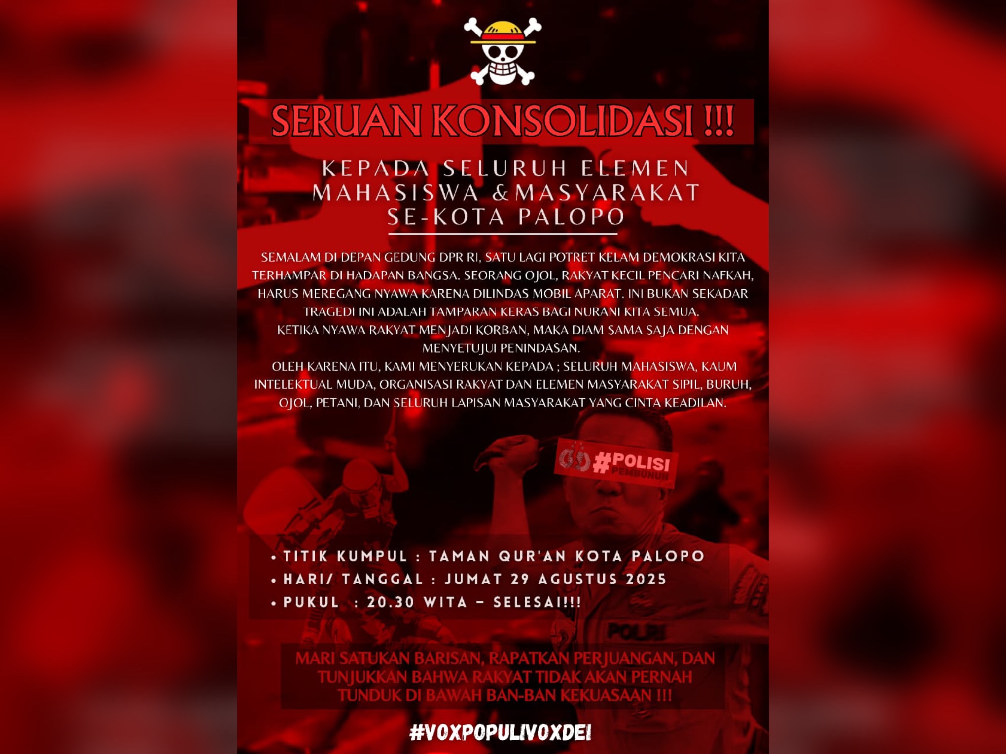 SENTRUMnews.com, PALOPO — Sebuah pamflet digital bertajuk “Undangan Konsolidasi Aksi Solidaritas” beredar luas di media sosial, Jumat (29/8/2025).
