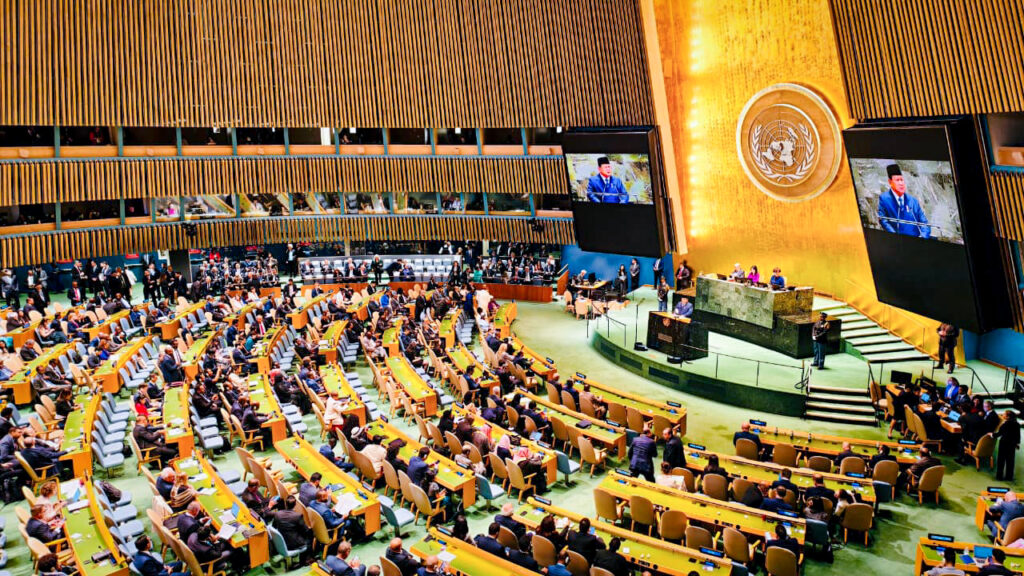 SENTRUMnews.com, NEW YORK – Sorot lampu dunia mengarah ke podium Sidang Majelis Umum ke-80 Perserikatan Bangsa-Bangsa. Di kursi kehormatan urutan ketiga, setelah Amerika Serikat dan Brazil, berdiri Presiden Republik Indonesia, Prabowo Subianto. Dengan suara tegas yang sesekali mengetuk meja kayu di hadapannya, Prabowo memulai debutnya di forum global.
