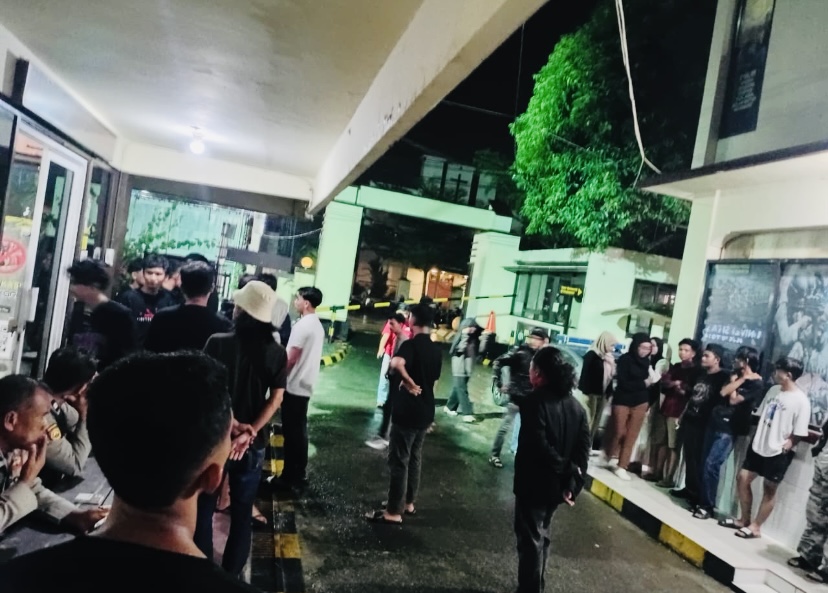 Puluhan mahasiswa berkumpul di depan SPKT Mapolres Palopo, Minggu dini hari, (19/10/2025), usai dugaan penganiayaan oleh oknum Brimob. (FT: Dok. Ist)