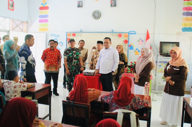 Bupati Luwu Patahudding memeriksa menu Program Makan Bergizi Gratis di SDN 227 Larompong, Kamis (23/10/2025). Ia memastikan makanan siswa memenuhi standar gizi dan higienitas. (FT: Dok. Hms)