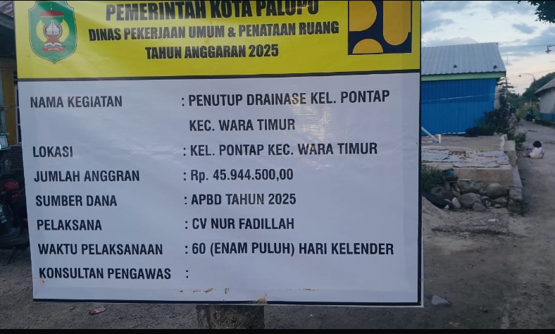 Dalam papan proyek di lokasi, tercantum bahwa pekerjaan ini dilaksanakan oleh CV Nur Fadillahdengan nama kegiatan Penutup Drainase dan waktu pelaksanaan 60 hari kalender. Tak ada nama konsultan pengawas yang tercantum di papan proyek.
