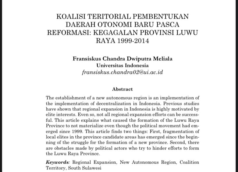 Berita ini disusun berdasarkan kajian akademik berjudul “Koalisi Teritorial Pembentukan Daerah Otonomi Baru Pasca Reformasi: Kegagalan Provinsi Luwu Raya 1999–2014” karya Fransiskus Chandra Dwiputra Meliala (Universitas Indonesia), yang dimuat dalam Jurnal Review Politik Volume 12, Nomor 02, Desember 2022, setebal 18 halaman.